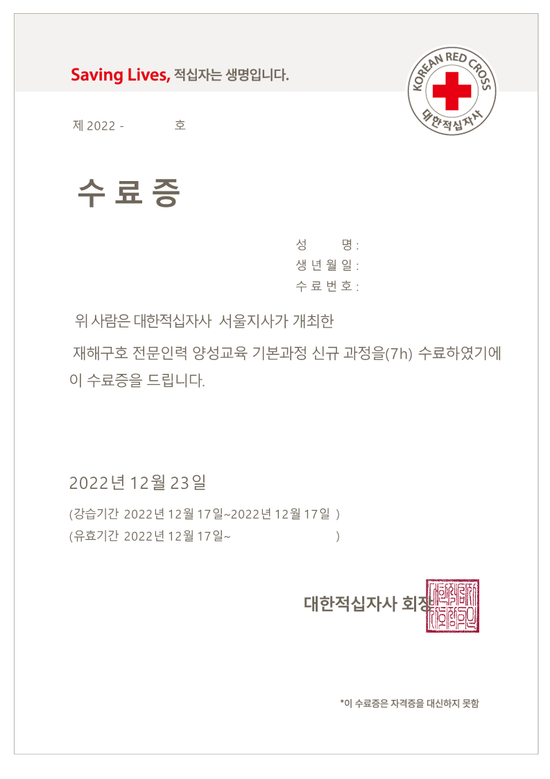 재해구호 전문인력 양성교육 기본과정 수료★ 본문