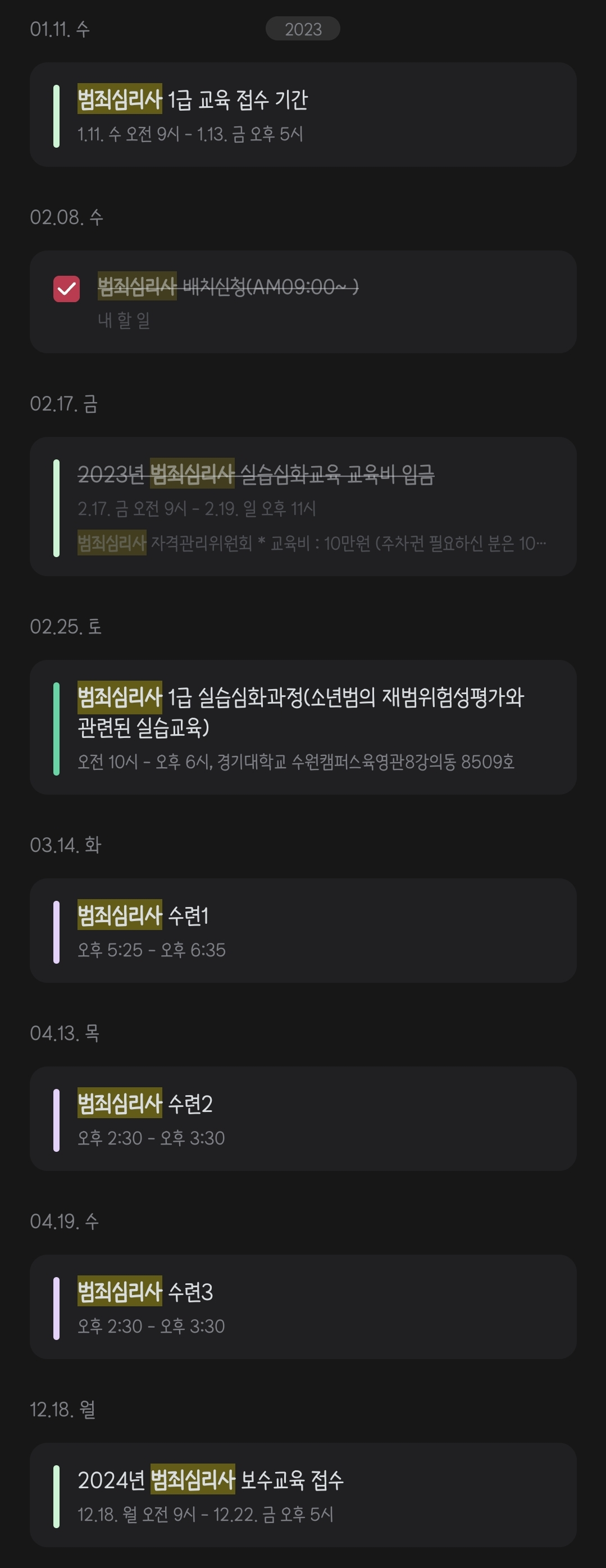 오래 전에 범죄심리사 1급 수련생이 되었지만, 수련 공백 3년을 넘었다가 다시 수련을 시작하게 되었다. 비록 취업과 이사 때문에 만난 청소년 수는 얼마 안 되지만, 다시 열심히 수련해 보고자 한다! 1월에 보수교육 들으면서 슬슬 시동 걸어야지.