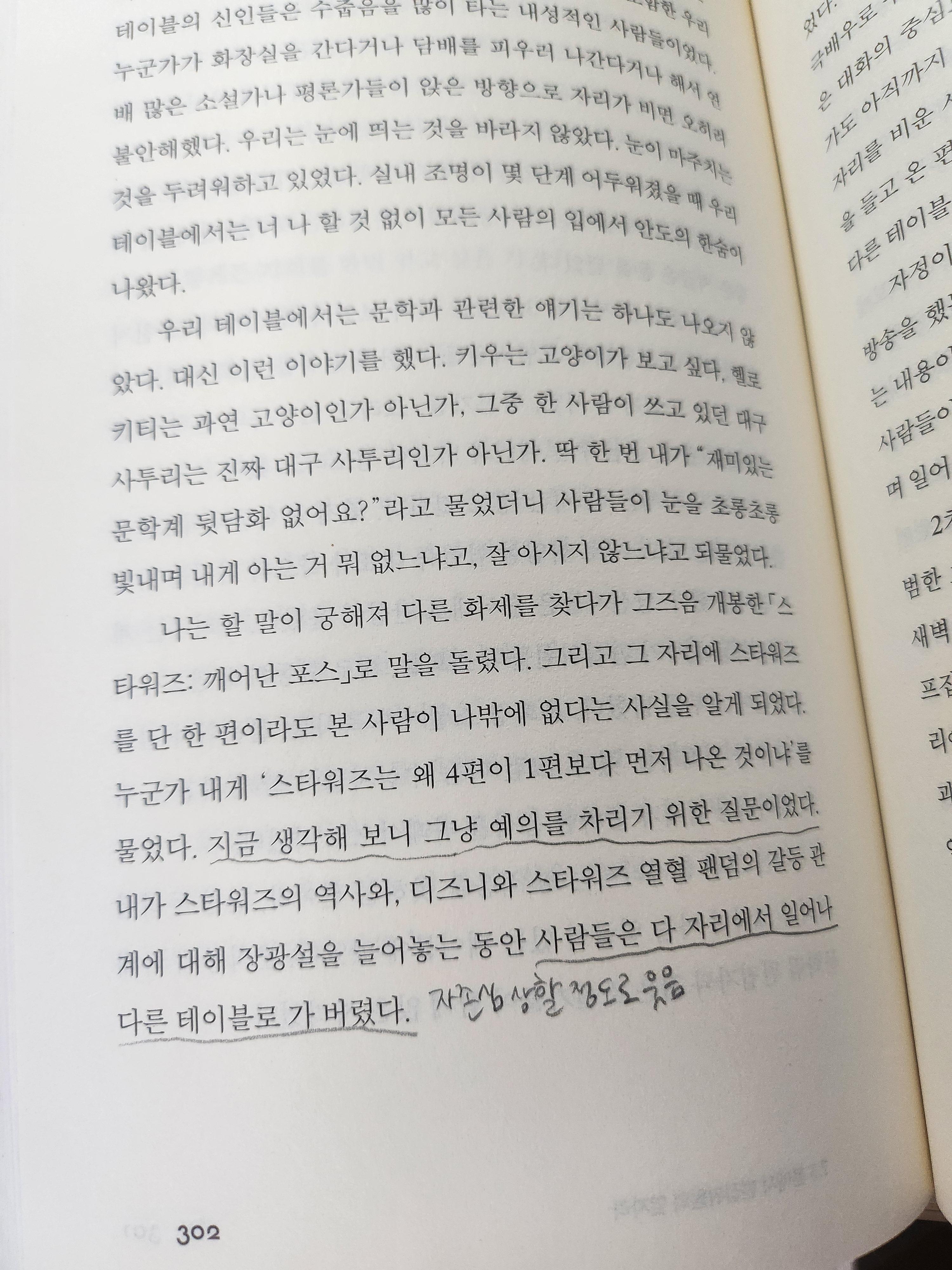 책을 읽고 글을 남기는 것은 이 책의 내용과도 관련이 있다. 작가가 독자들이 진짜 존재하는지 궁금해한다고 하였고, 새로운 문예운동이 필요하다고 하였다. 여태 책에 대해 잘 쓰지 못한 이유는 떠오르는 다양한 생각들을 잘 꿸 자신이 없었기 때문이다. 남기고 싶은 게 너무 많고, 잘 엮어서 제시하고 싶었다. 하지만 신혼여행에서 목표한 대로 하루도 빠짐없이 글을 써 보니, 쓰고 싶은 걸 다 쓰지 못하는 데에서 오는 아쉬움보다 몇 글자라도 쓴 뿌듯함이 더 컸다. 그래서 아쉬움을 감수하기로 했다.