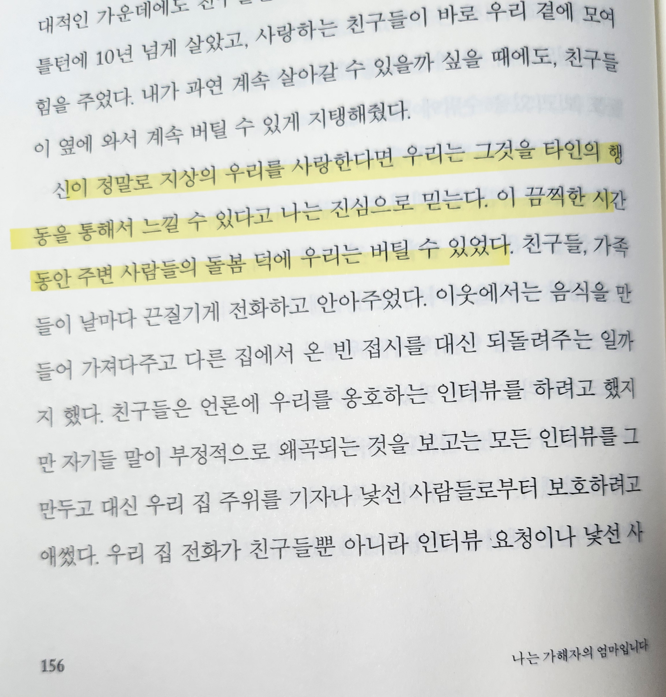 신이 정말로 지상의 우리를 사랑한다면 우리는 그것을 타인의 행동을 통해서 느낄 수 있다고 나는 진심으로 믿는다. 이 끔찍한 시간 동안 주변 사람들의 돌봄 덕에 우리는 버틸 수 있었다.