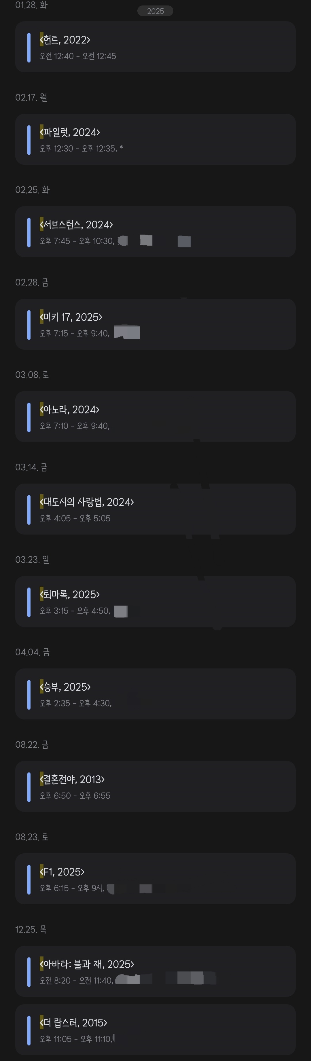 나이가 들수록 영화에 느끼는 흥미는 떨어지고 있다. 그래도 정리해 보니 꽤 많이 봤네. 오래전에 나온 영화를 집에서 홀로 감상하는 걸 좋아했는데, 이제는 영화관에 가는 빈도가 늘어났다. 12회 중 7회는 극장에서 봤으니!