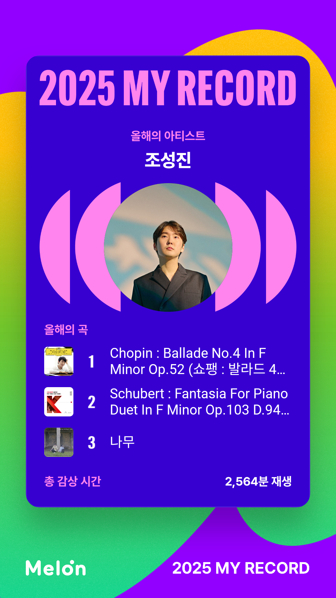학원에서 여는 피아노 연주회를 준비하면서 랑랑의 연주를 자주 들었다. 처음에는 '앨범 녹음을 야무지게 했구나.' 싶었지만, 연주가 끝난 뒤 관객들의 박수 소리가 들릴 때 '와... 중국 최고의 자랑이다.'라는 생각이 절로 드는 라이브 곡이었다. 그리고 Y선배와 슈베르트 판타지 포핸즈를 다시 맞춰보기로 함으로써 김대진, 문지영 피아니스트의 곡도 자주 들었다. 하지만 그 사이를 파고든 조성진의 쇼팽 발라드 4번......! 결국 2026년은 이 대곡으로 레슨을 받기로 했다. 한 2년 정도는 쳐야 손톱만큼이라도 표현할 수 있지 않을까 생각한다. 그렇게 어렵다는데 또 왜 이렇게 좋은지.