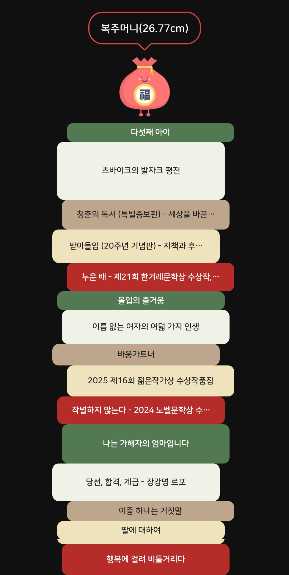 다른 독서 기록 어플을 사용하다가 북적북적으로 갈아탔다. 이북리더기 유저들의 네이버 카페에서 이 어플로 다들 독서 인증을 하는 것을 보고 귀여움에 반해서 유료 결제를 해 버렸다. 책 권수뿐만 아니라 두께를 합산해 줘서 벽돌 책을 완독한 뿌듯함을 챙겨 준다는 장점이 있다. 『츠바이크의 발자크 평전』이 올해 최고 벽돌 되시겠다. 원래 cm별 캐릭터가 다르지만 지금은 새해라 복주머니가 스페셜 친구로 왔다.